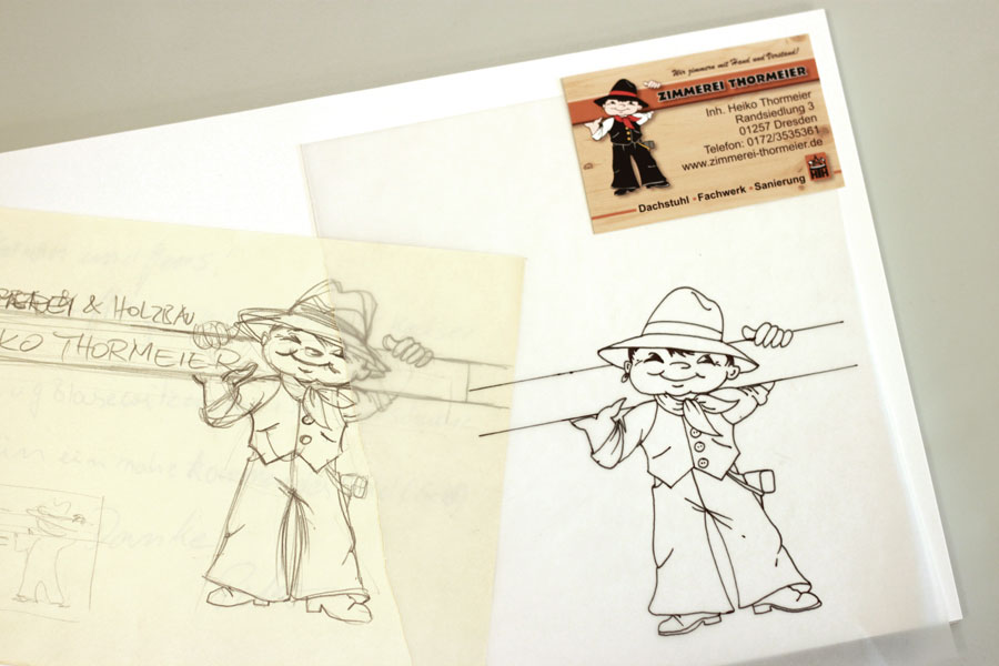 Die Zimmerei Thormeier aus Dresden beauftragte gleich bei ihrer Gründung ein Maskottchen, welches die Leistungen der Firma auf nette Weise dem Kunden offeriert. Der kleine Zimmermann ist nun schon viele Jahre auf allen Werbemitteln für das Unternehmen tätig, von der Visitenkarte über die Fahrzeugbeschriftung bis zur Webseite und sorgt für einen unverwechselbaren Firmenauftritt, da die Produktion aller Werbeträger immer aus einer Hand erfolgt.